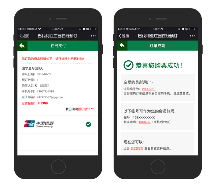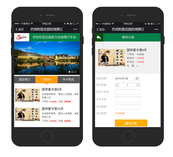 1.实现便捷的微信支付功能。用户点击在线预订菜单进入景点详情页并填写订票数量、取票人、手机号码等信息,根据客户需求,用户提交订单后将进入微信支付页面,完成交易