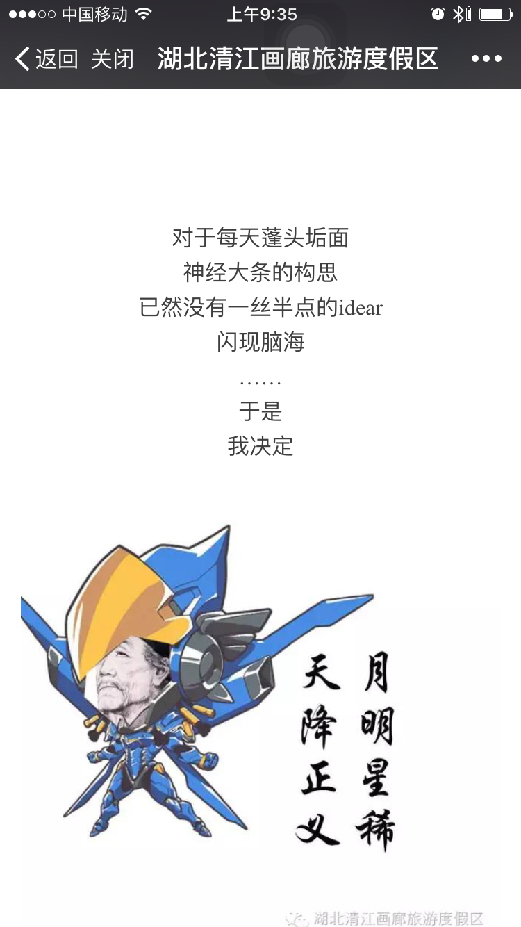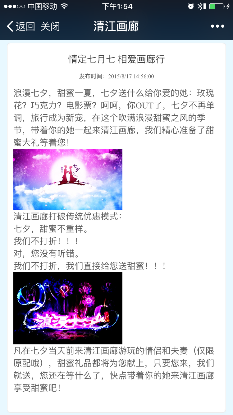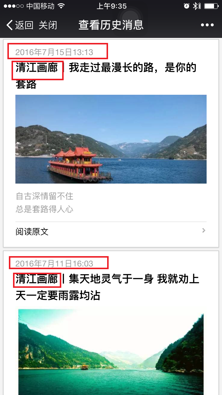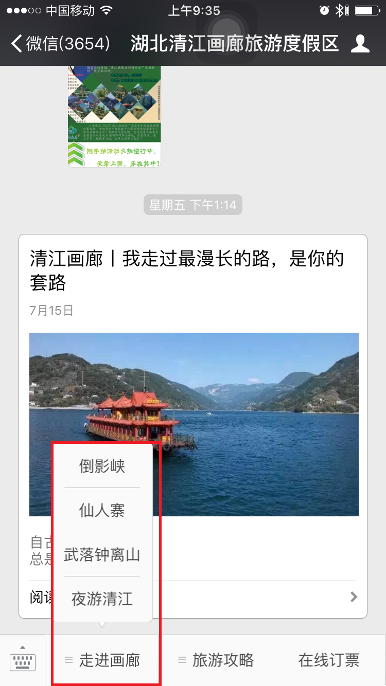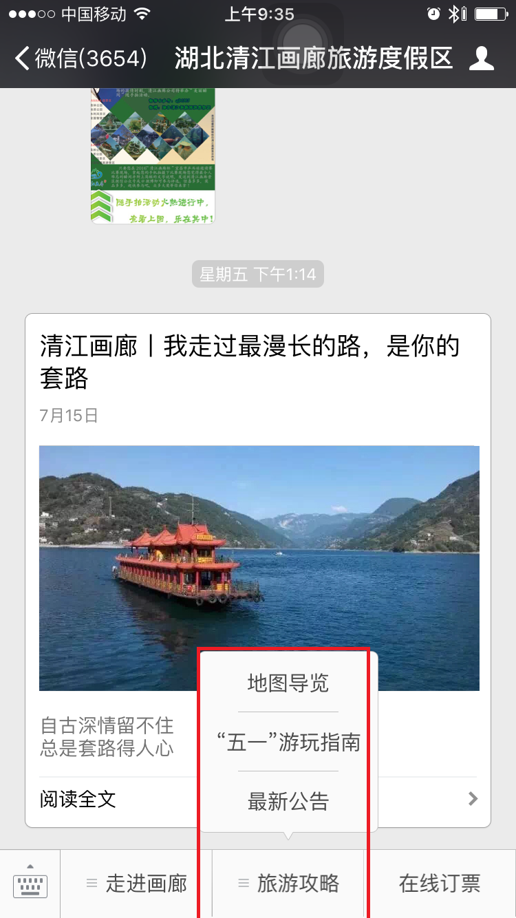 微信公众号每次发送最高可以发送可发8篇。但清江画廊却选择每次发送只发一篇作的形式,这种方式虽然可让文章最大的曝光与分享,但是这对文章制作要求与原创要求非常的高,为什么我们春晚年年被吐槽,但收视率去一直居高不下,很大原因是,他每个节目都是为每个群体量身制定的。而我们一个景区的微信公众号少说也有十多万人,每个人都有不同的需求,而一篇文章需要让微信公众号每个群体都有阅读感,制作层度不可不高。而我们从清江画廊微信文章可看出,不管是图片,排版,与表达形式比较好。缺陷是发布时间微统一 ,如上图第一条文章发布时间是2016.7.15而第二篇文章是2016.7.11.如果文章不规定固定时间发布,难培养用户按时消费内容因为习惯,让用户对微信公众账号减少粘性