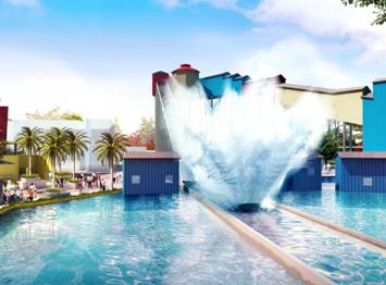 飓风湾主题区是水上项目的聚集区,以美洲海域风情为文化背景,突出阳光、运动、活力和热情,以舒展的空间效果结合沙滩、海浪元素,创造主题区的特色体验。