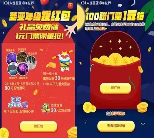 大连圣亚海洋世界策划的年终发红包,礼品免费领,1元门票限量抢的活动,充分满足了客户需求,富有节日气息的活动页面是吸引用户的重要筹码,而各式各样的礼品和优惠则提升了用户的参与热情,增加活动的吸引力。本次互动活动亦很好的契合了当下的时令节庆,为品牌的宣传奠定了一定的基础,有效吸引带动用户参与,为品牌景区的知名度和销售额带来了一定的提升。