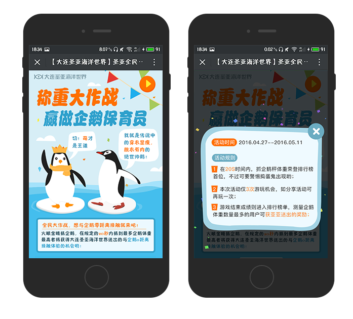 此次“圣亚全名儿童节 赢做企鹅保育员”的微信活动,以六一儿童节为主题,结合比赛游戏的形式,更容易吸引用户的目光。能够传递出品牌的核心价值,进而提升品牌的影响力。本次推出体验“企鹅HELLO喂”活动,既符合大家的心理行为,又让大家能相互沟通联接起来。