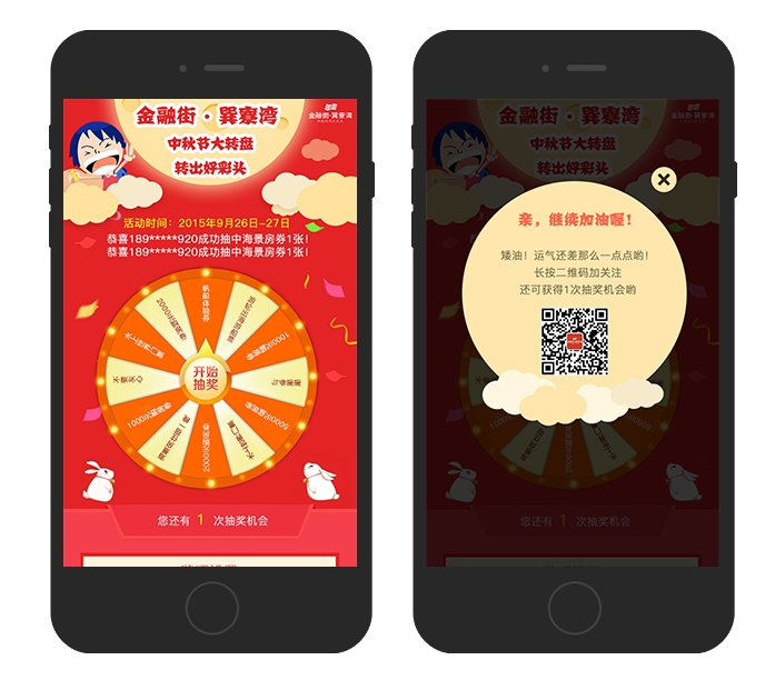 活动页面风格活泼展现了金融街·巽寮湾的独特魅力。利用大转盘秒杀抽奖的形式来吸引新的用户,从而促使粉丝量的增长,同时也做好了与本有用户的良好互动!