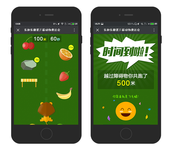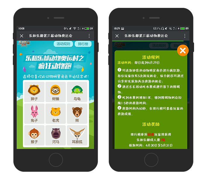 重庆乐和乐都疯狂动物跑微活动以明星动物奔跑躲避障碍物的趣味形式配上扁平化的动物形象设计进行,活动趣味十足。活动创意以奥运为话题展开,结合乐和乐都线下活动来进行,用动物明星代表来进行奥运会奔跑选拔赛,游戏设立排行榜单,最终排行榜单最高者可获得乐和乐都送出的奖励。