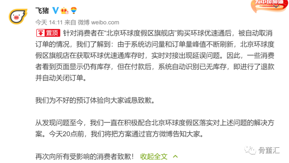 面对网友们的吐槽,9月14日晚间,飞猪也紧急回应称,订单被自动取消在于:系统访问量和订单量峰值不断刷新,北京环球度假区旗舰店在获取环球优速通库存时,实时对接出现延误问题。因此,一些消费者看到页面显示仍有库存,但在付款后,系统自动识别已无库存,即进行了退款并自动关闭订单。