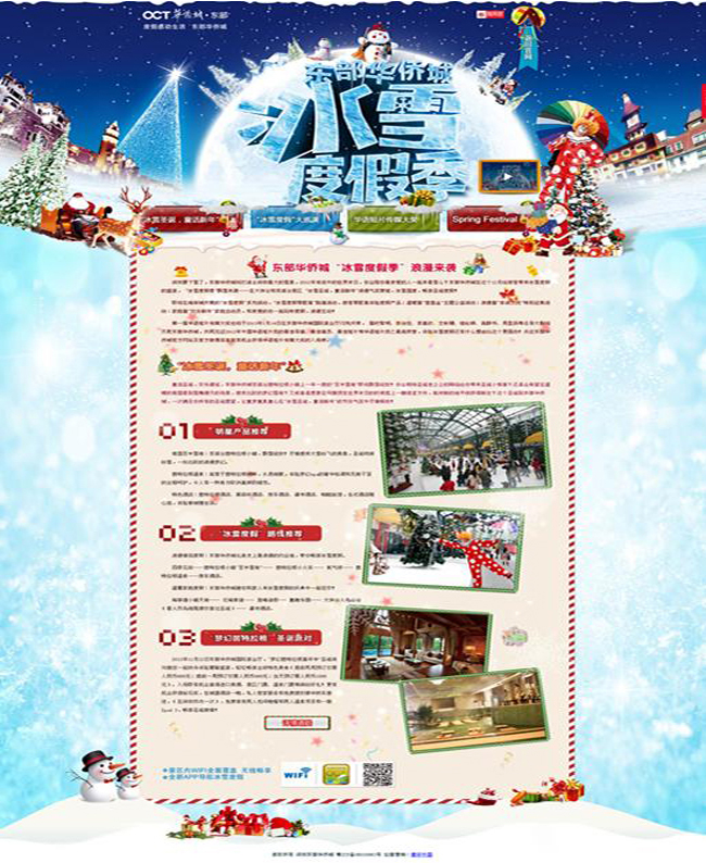 各项数据表明,在项目进行的两个多月时间里,各项目标均顺利达成,品牌营销成效显著,仅是东部华侨城官网流量日均PV便达到25,631,较推广前一月各项流量指标均有较大幅度的提升,大大提高了网站转化率。活动专题站点方面,采用单页的形式,将圣诞春节元素创意融合,呈现出中西结合风格的欢快节日气氛,喜庆十足,视觉感染力强;活动站点设有视频播放链接和微博、微信、景区APP下载链接入品,体现了用户体验和品牌营销概念;