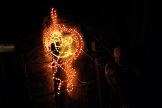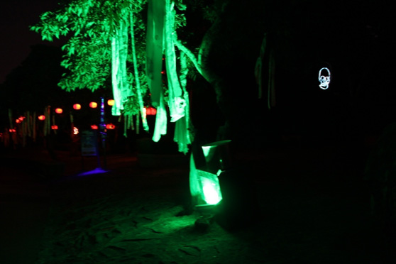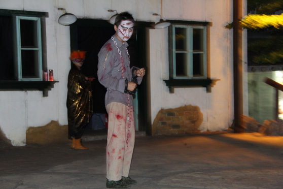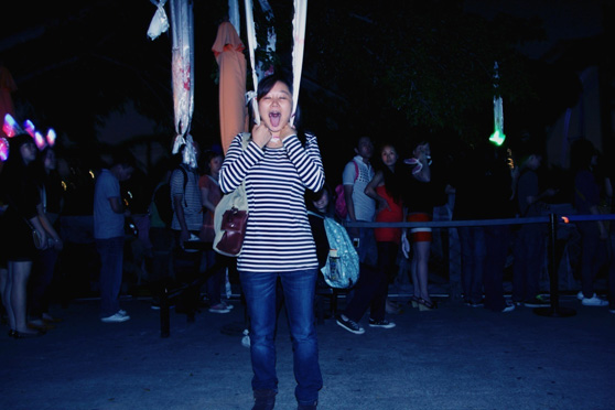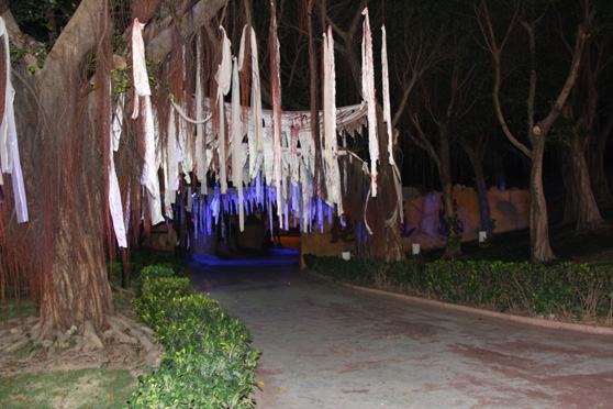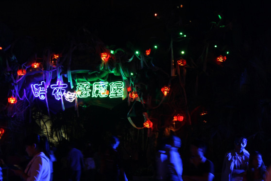 来之前,还不觉得有什么害怕的,进到黑暗的园区后才发现,环境不是一般的可怕~~随处可见的南瓜灯、纱缦、骷髅、蜘蛛网、斑斑血迹装点出一个阴森森的世界,加上音响播出的惊悚鬼叫,还没玩,心已经慌得不行了,毛骨悚然啊……