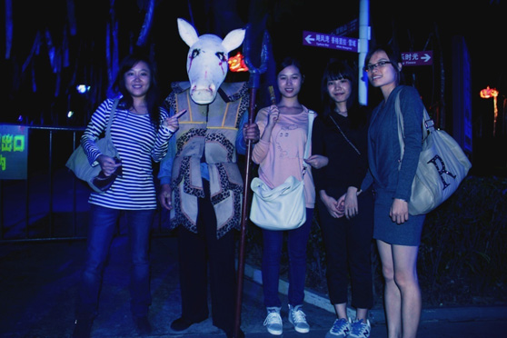 好容易躲在3D电影区安安稳稳看了10多钟电影,出来又要面对一堆厉鬼了。“人·妖夜店”、十八层地狱、夺命车间、雪界、异度空间、灵异归来、荒岛女中、美丽医院、2BM公司、“清宫梦魇”、玛雅祭、七彩迷宫等,这些鬼屋名字一个比一个吓人,经过前面的惊吓,我们几个决定打死都不进鬼屋了,估摸着时间还早,在园区四处转转就回去了。