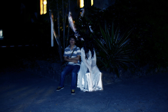 只好手拉着手往前走。准备去看3D电影区,还没走几步,前方黑暗处突然幽幽地走出一个白衣长发男鬼,缓缓朝我们走来,一声声惊恐的尖叫立马响起,姐几个四散跑开,还没站稳,又一个清宫女鬼,挥着血色厉爪……妈啊,真的好恐怖啊