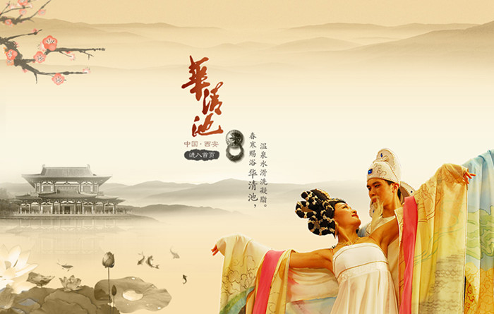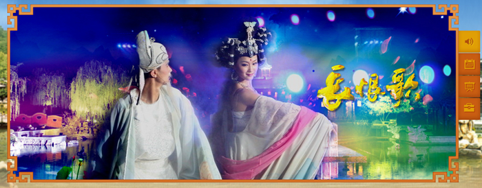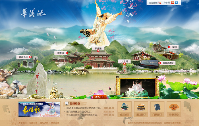该设计采用Flash动画作为表现形式,将园区主要景区和特色要素创意融于其中,飞翔的仙鹤、流动的汤池、游泳的白鹅和鱼群以及摇曳的清荷等富有生机的景物与远距离的青山、飘浮的云烟共同营造了仙境般的华清宫,此番美景,配以在花瓣雨中起舞的杨贵妃和唐明皇,不禁让人联想到“不尽温柔汤泉水,千古风流华清宫”,给这个古代离宫更添几分浪漫色彩。Flash动画的设计不仅能让景区信息得到更直观的展示,而且增强了信息传达的深度,更能吸引用户长时间的停留。