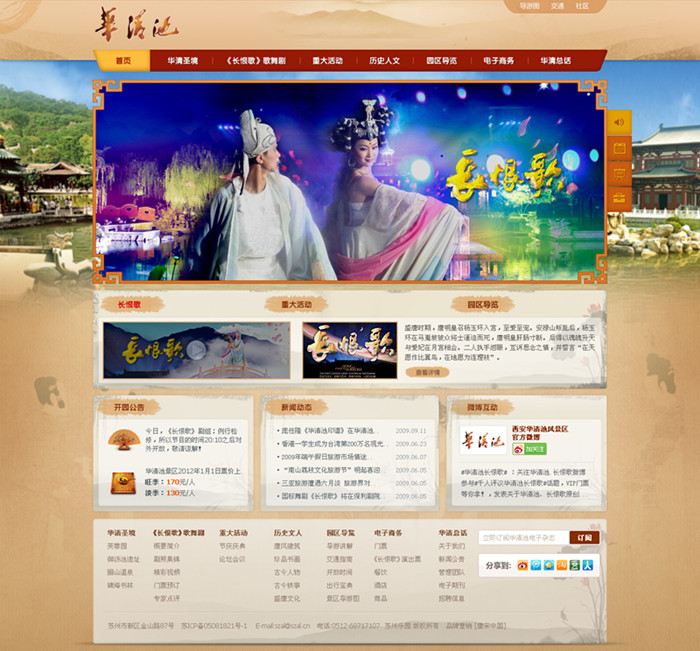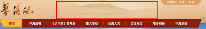 设计二采用的是静态页面的但设计二,在网页格调上更倾向清素淡雅。整体页面采用泛黄色调,给人厚重的历史文化沉淀感,这与华清池的景区特色是相一致的。