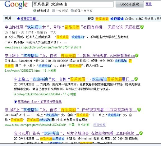目前在厦门中山路一个美眉穿着“吾系美眉欢迎搭讪”T恤照耀过市, 关于这件事情的帖子在厦门小鱼网引起很大的轰动, 两天时间累计点击量超过30000次。