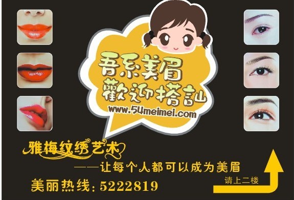2、一句双关的口号, “吾系美眉 欢迎搭讪”, 这里的美眉可以理解为美女, 也可以理解为美化眉毛, 这句话给人足够的联想空间。