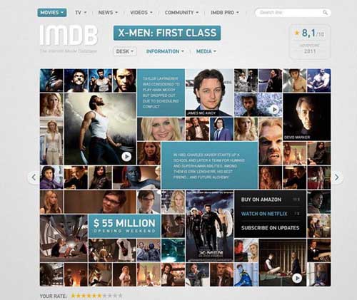 设计师Vladimir Kudinov在自己的Behance页面中发布了这一设计作品。原始的IMDB首页设计来的更传统,而Vladimir的设计则采用了图片拼贴的方式来呈现,大小错落的照片围绕着纯色底的文字选框,充满了视觉冲击力。