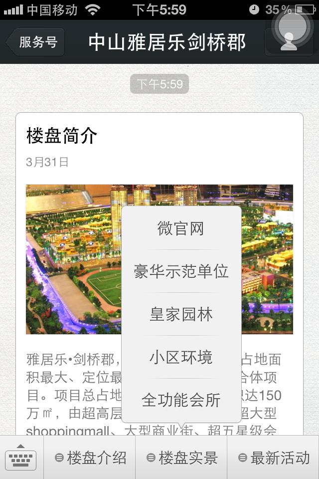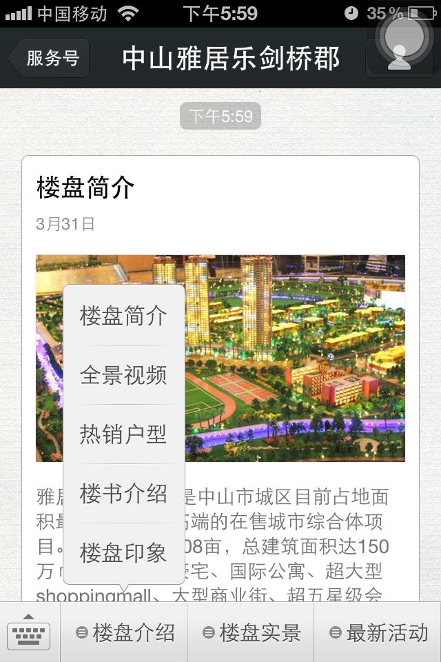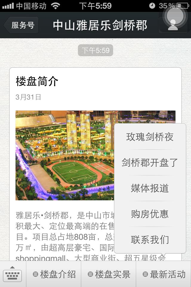 ——在微信菜单的第三栏,增加交互功能,让游客第一时间能联系到地产的售楼处,了解信息的消息。