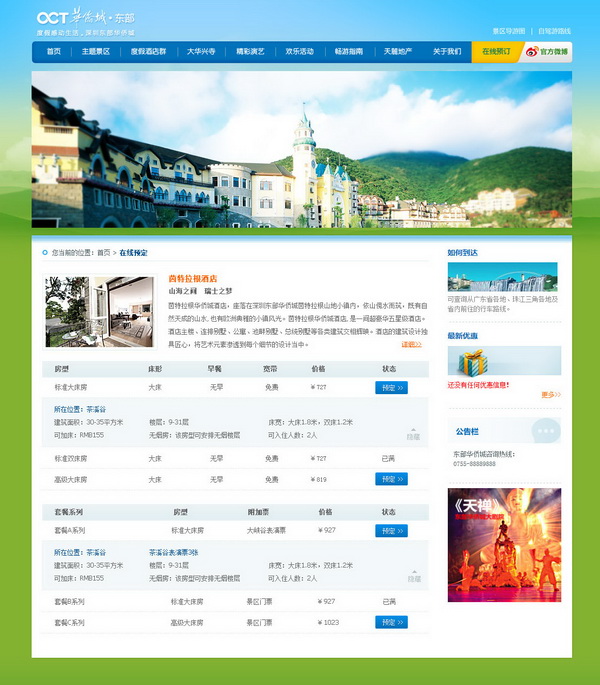 ● 界面设计清新、大气,顶部banner随门票种类而不同,如酒店预订页面banner图为东部酒店群,体现用户体验概念;