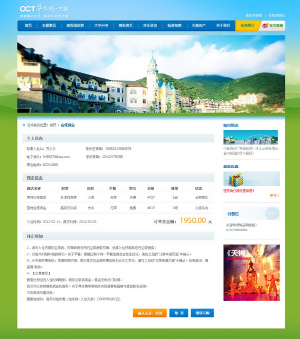 选择支付方式后,系统显示订单完整信息,提醒用户对订单进行最后确认并完成结算,该页面还附有订单二维码,用户须凭该二维码到景区取票处取票,至此,用户完成东部华侨城酒店预订整个过程