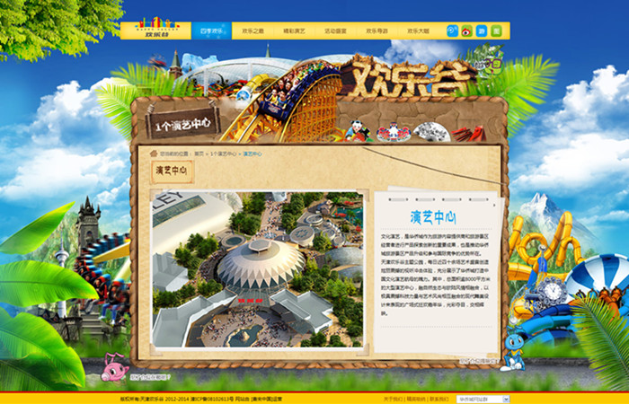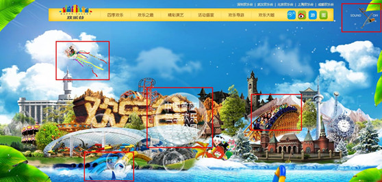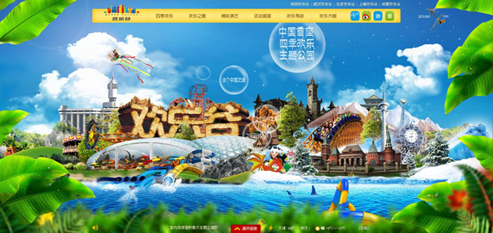 首页采用四周布满草丛和树叶的独特视角,将一个欢乐、好玩的主题公园呈现在访客面前,犹如拨开枝叶,惊现世外桃源;明媚的阳光、飞絮的雪花、飞扬的风筝、悦耳的音乐、飘浮的气泡、自由自在嬉水和过山车上欢乐的人们以及天津民俗节日的年画剪影等元素展现了一个活泼、欢快的游玩乐园,充分体现了天津欢乐谷四季皆是游玩好去处的品牌特质;此外,在漂浮的气泡中嵌入品牌宣传标语,既创新个性,凸显品牌活力,又体现了品牌营销概念。
