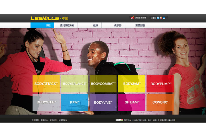 新建的莱美中国官方网站整体风格动感十足,激情四射,视觉感染力强;我们在创意设计过程中力求融入炫彩、时尚等多种元素,以突出健康、富有活力的主题;采用富有张力的人物元素为设计背景,传递健康时尚气息;色彩丰富的快捷菜单(即莱美健身课程目录),体现了莱美项目的多元化,也是了解内容详情的快速通道。