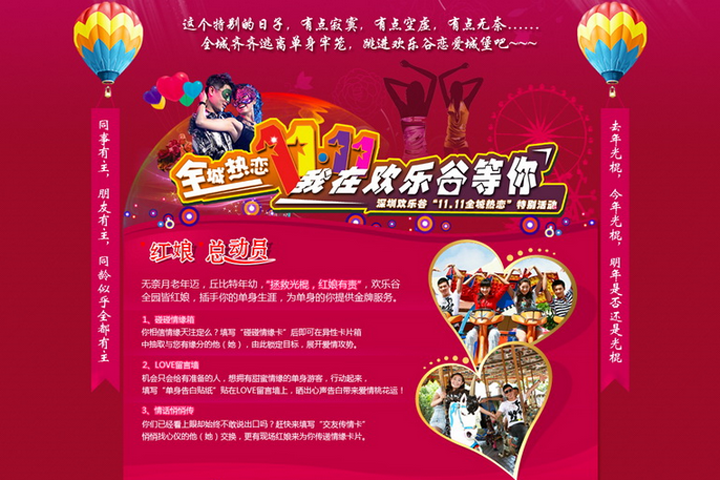 深圳欢乐谷是华侨城集团新一代大型主题乐园,首批国家AAAAA级旅游景区,是国内投资规模最大、设施最先进的现代主题乐园。 "光棍节"起源于校园、通过网络等媒介快速传播的节日正日益风靡大江南北。欢乐谷针对此主题举办"全城热恋,我在欢乐谷等你!"活动。
