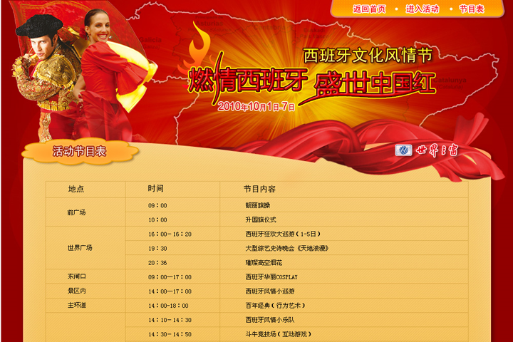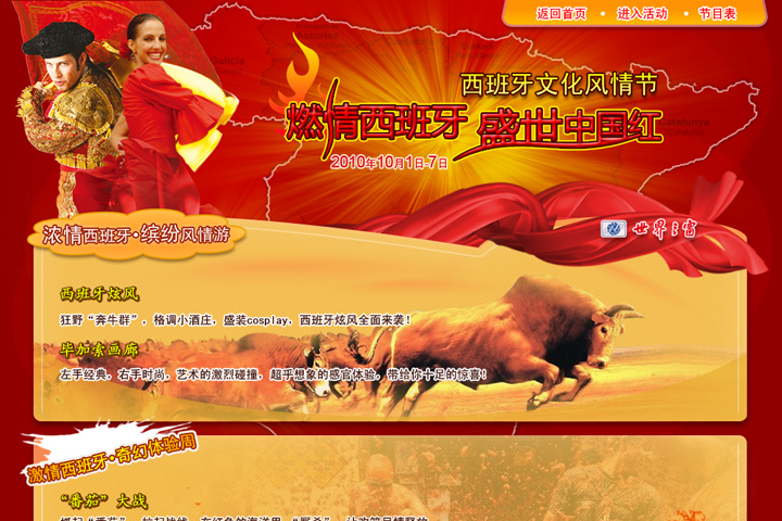 2.页面色调感觉相当热辣,正值十一国庆期间,西班牙的火与中国的大红结合起来!浓浓中国风,重重西班牙情,异域的风情,民族的骄傲。