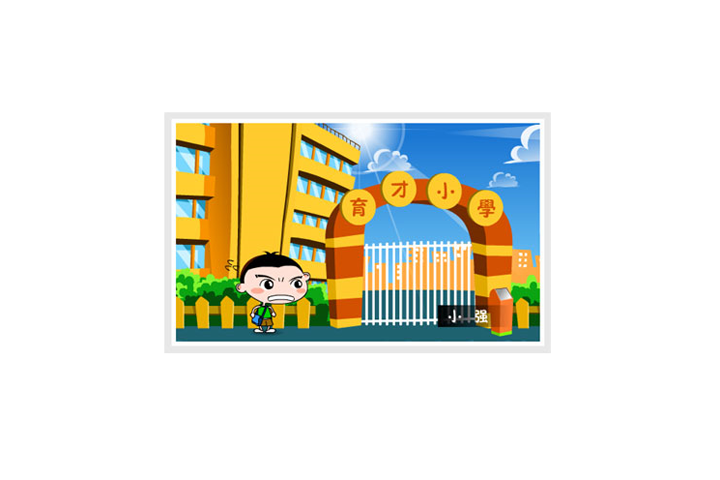 2、近景,一个学生,旁边注明“小明”走近校门口。