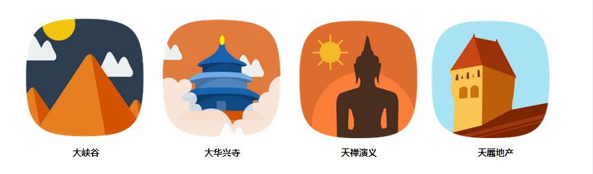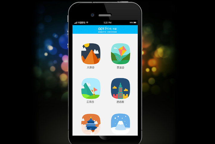 创意解释:为了整体的风格,唐宋中国统一采用“扁平化”的界面风格,为东部华侨城定制Icon(图标)。图标采用暖色系风格,烘托景区接待游客的热情,并且在背景的承托下相得益彰!不仅灵活展现景点地标,更通过页面动画让浏览过程中,增添趣味!